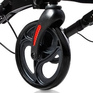 Su sistema de plegado rápido en paralelo y el clip de seguridad garantizan un transporte y almacenaje cómodos y seguros. Las ruedas reforzadas de 19,5 cm de diámetro aseguran estabilidad en distintos terrenos, y los frenos de maneta aportan control y tranquilidad durante el uso.