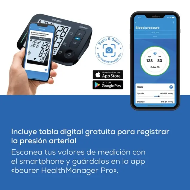 El Beurer BM 54 es la puerta de entrada a la gama conectada de Beurer: incorpora Bluetooth 4.0 Smart para sincronizar automáticamente todas las mediciones con la app beurer HealthManager Pro (gratuita para iOS y Android). Desde el móvil se pueden ver gráficas de evolución, compartir informes con el médico y configurar recordatorios.
